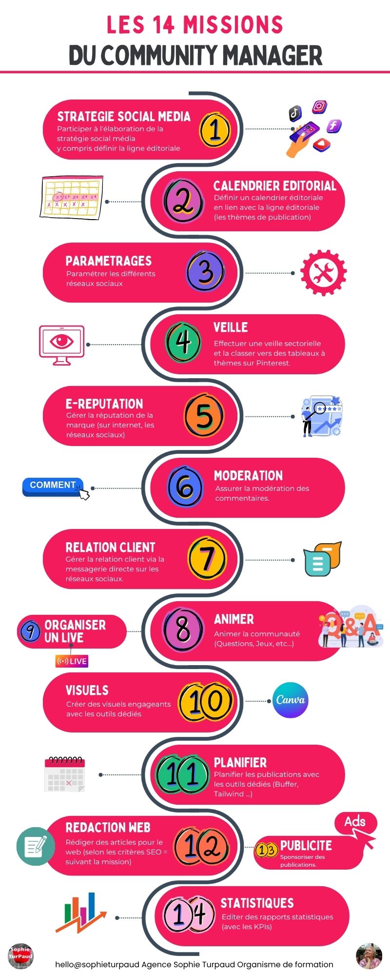 infographie les 14 missions du community manager (1) par SophieTurpaud | Oct 1, 2025 | 0 commentaires Poster le commentaire Annuler la réponseVotre adresse e-mail ne sera pas publiée. Les champs obligatoires sont indiqués avec *Commentaire * Nom * E-mail * Site web Enregistrer mon nom, mon e-mail et mon site dans le navigateur pour mon prochain commentaire. Δ Ce site utilise Akismet pour réduire les indésirables. En savoir plus sur la façon dont les données de vos commentaires sont traitées.
